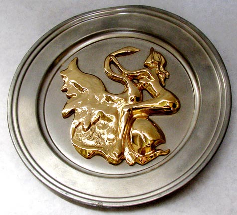 I was recently hunting through cyberspace for this medallion when I ran into an intersting item. It appeared to be the Leda and the Swan medallion, but I noticed that the reverse side did not have a serial number. Upon discussion with the seller, I discovered that the composition of the medal was identified as pewter by a stamp on the rim.